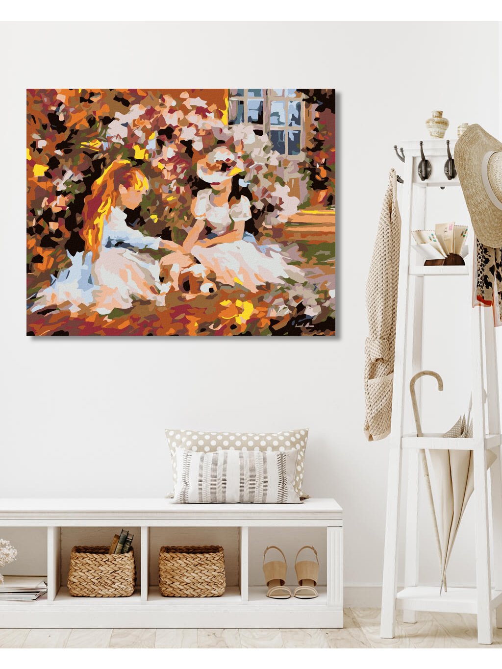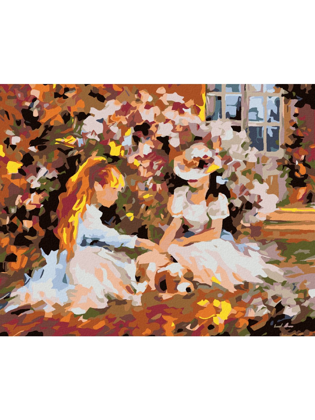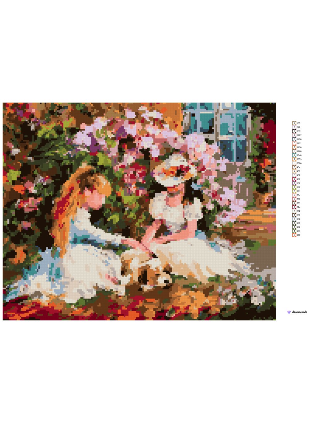Diamantové maľovanie - DIEVČATÁ V ZÁHRADE A ŠTENIATKO