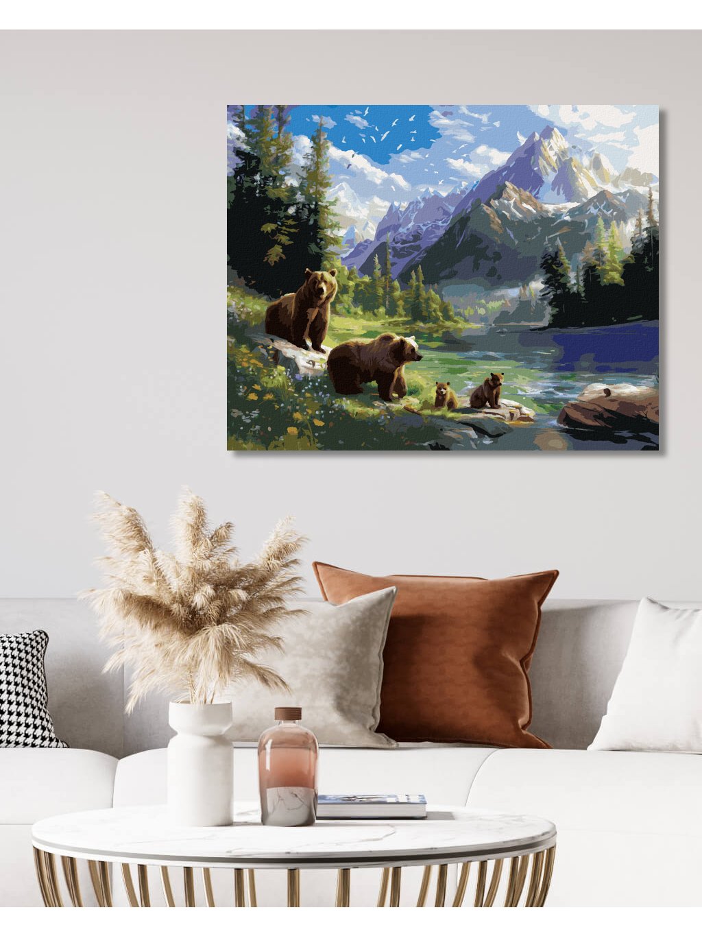 Diamantové maľovanie - MEDVEĎ S MLÁĎATAMI, JAZERO A HORY