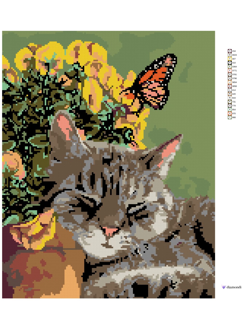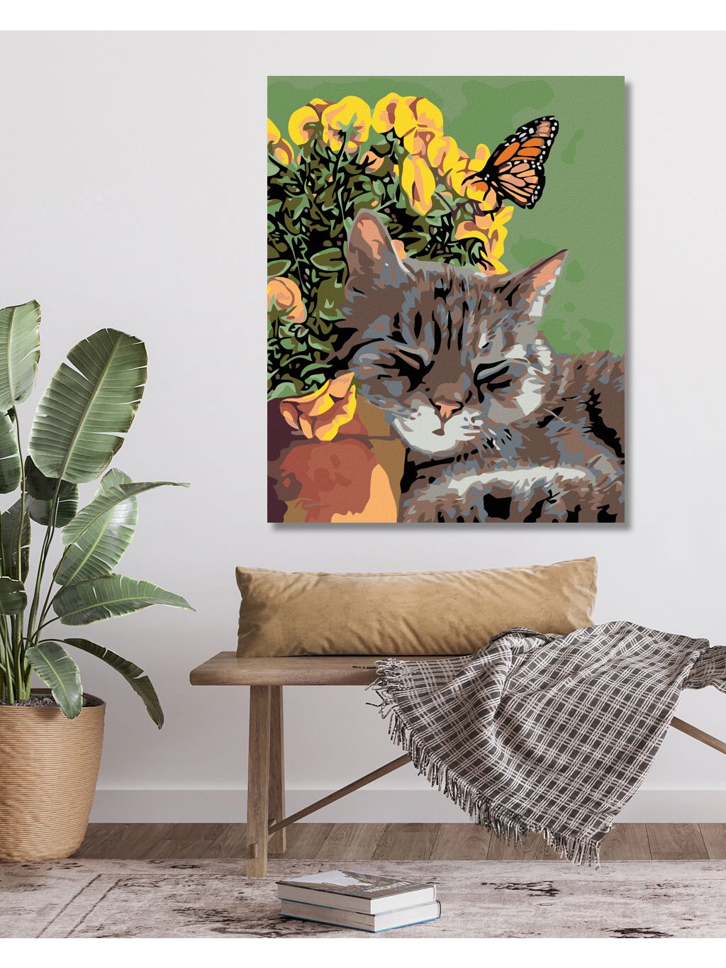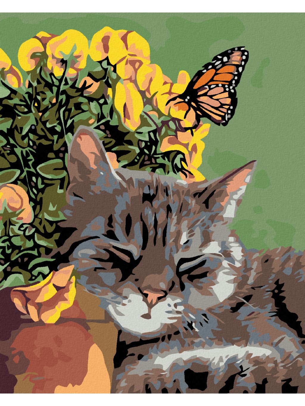 Diamantové maľovanie - ODPOČÍVAJUCI KOCÚR A MOTÝĽ V KVETOCH