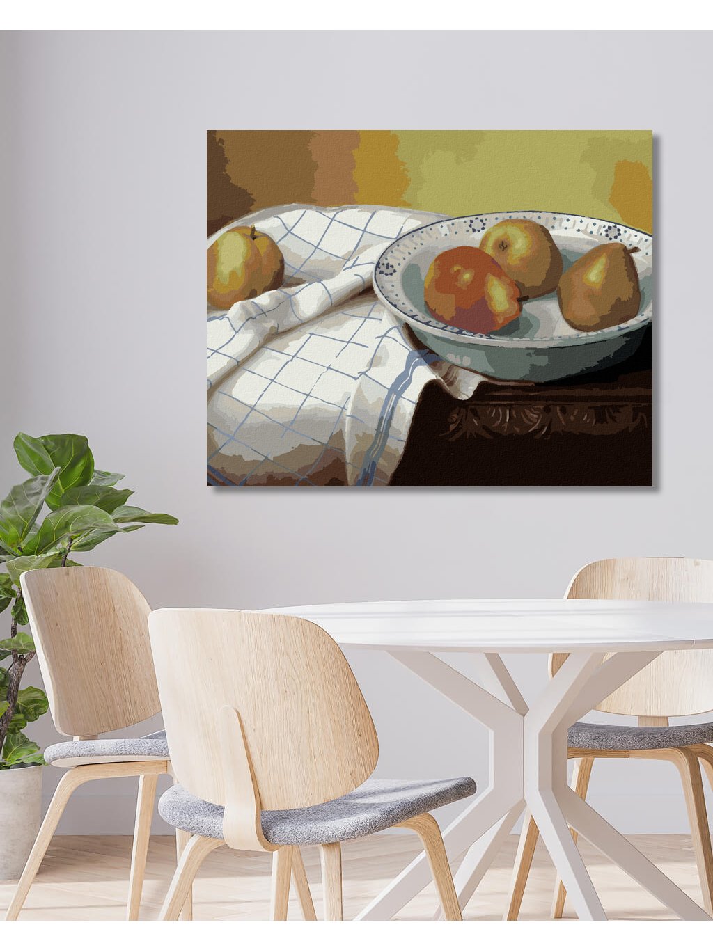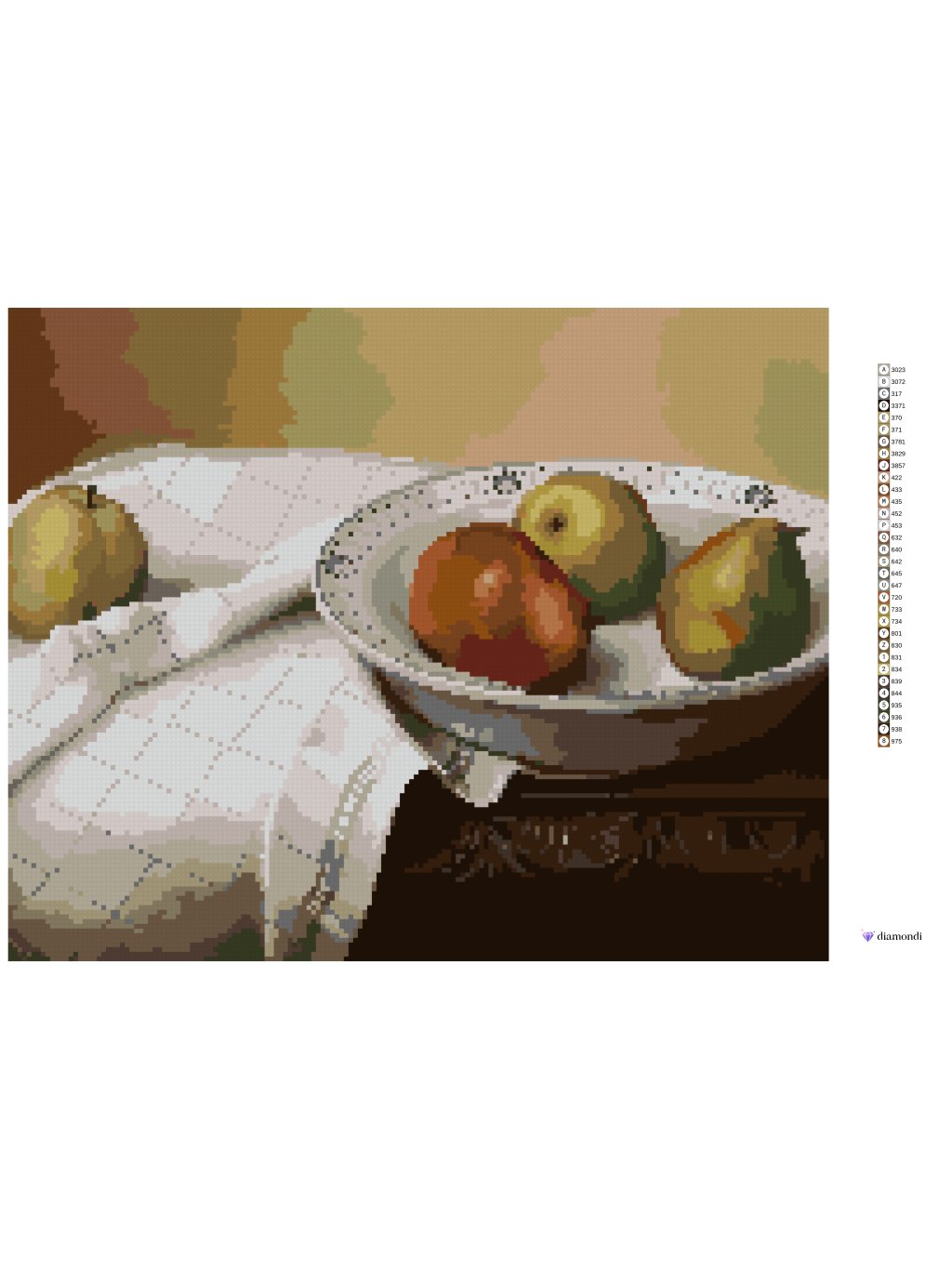 Diamantové maľovanie - ZÁTIŠIE HRUŠKY V MISKE A BIELA UTIERKA (PIETER WAGEMANS)